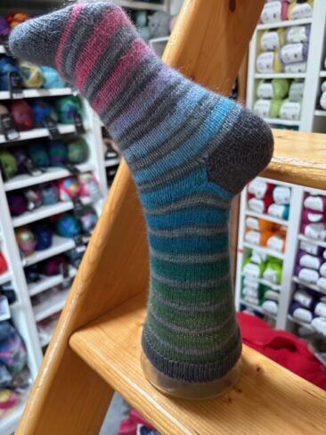 Daraus habe ich Toe-to-up ein paar Socken gestrickt, kombiniert mit Balance von Atelier Zitron für Bündchen, Ferse und Spitze.