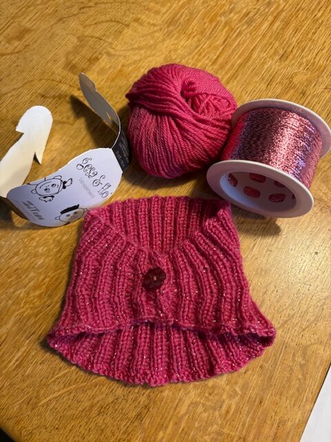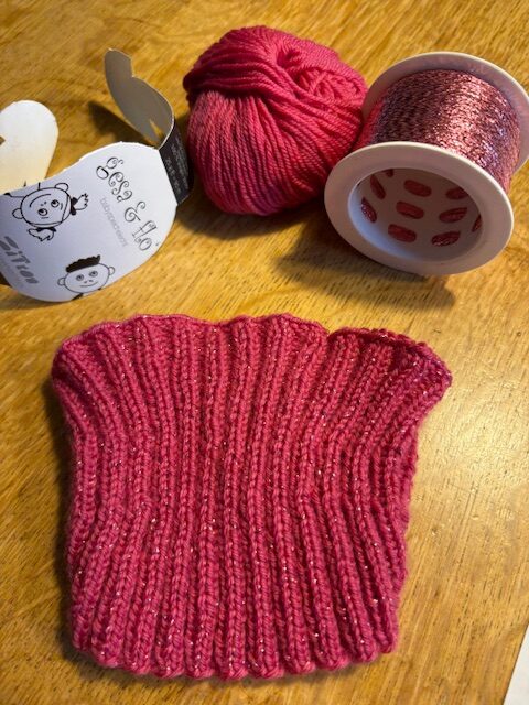So habe ich ein kleines Stirnband gestrickt (nach einer Anleitung von Stefanie Bettmann „Minerva“, die ich allerdings einem Kinderkopf angepasst habe. Ich habe auch die Abnahmen und die Mittelmaschen verändert.